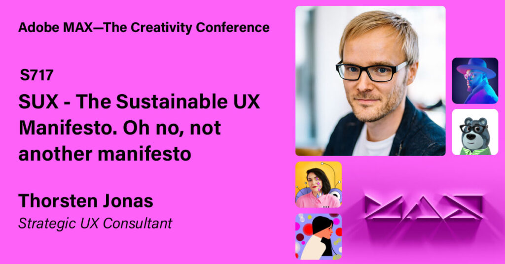 This talk at Adobe MAX 2021 is the point where the SUX Network started. The talk described the idea and the need to Sustainability in UX and was an invitation to a project called "The Sustainable UX Manifesto". A group of designers (Isabel Pettinato, Bavo Lodewyckx, Alice Markmann, Simone Brauner, Chris Stark, Sandy Dähnert, and me Thorsten Jonas) created a workshop format to work on Sustainability in UX based on the Sustainable Development Goals of the UN. This was from the beginning a very important part for us at SUX: Sustainability is more than "just" carbon emissions". 120 Designers from around the world joined in this decentralized workshop-project using a workshop templated to research on the relationship of UX and Sustainability and to develop ideas how to drive Sustainability through UX.